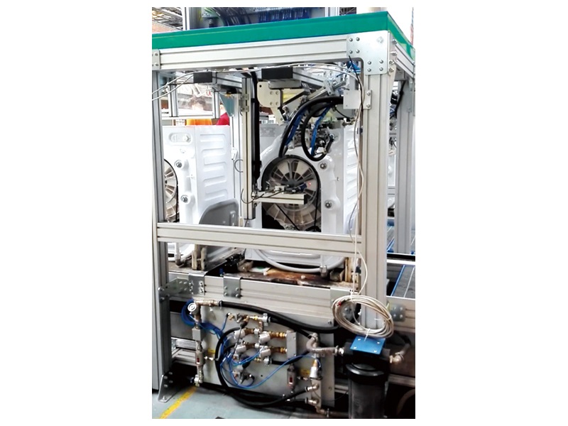 上海博諾自主研發的全自動站位式功能檢測,型式為站位式運行,洗衣機運行至檢測工位,自動插拔進水閥、排水管、供電插座,檢測臺位自動運行對滾筒洗衣機各項功能進行跟蹤檢測。