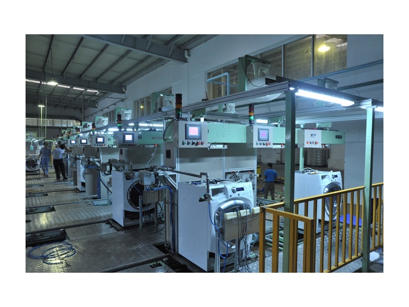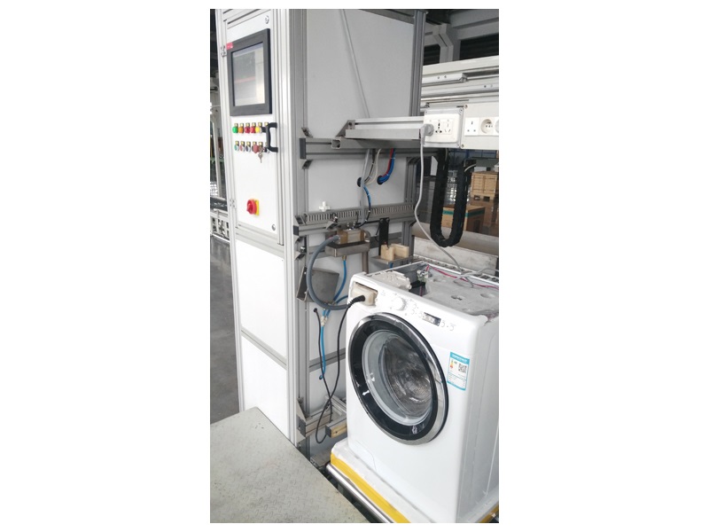 上海博諾自主研發的半自動站位式功能檢測,型式為站位式運行,洗衣機運行至檢測工位,人工插拔進水閥、排水管、供電插座,檢測臺位自動運行對滾筒洗衣機各項功能進行跟蹤檢測。